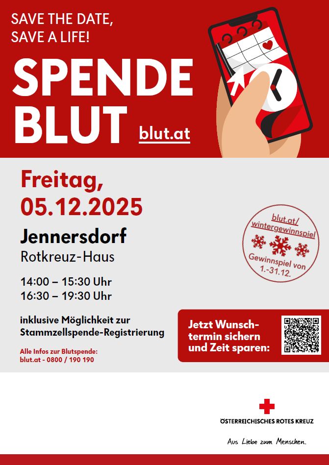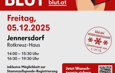 Am Freitag, 5. Dezember 2025 besteht die Möglichkeit, im Rotkreuz-Haus in Jennersdorf, Blut zu spenden.