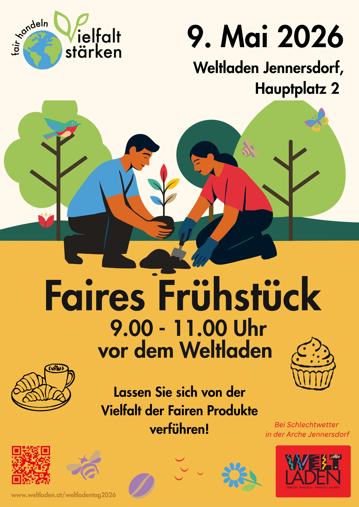 Der Weltladen Jennersdorf organisiert wieder ein „Faires Frühstück”, diesmal am Samstag, 9. Mai 2026 von 9–11 Uhr vor dem Weltladen in der Kirchenstraße.