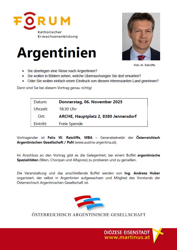 Vortrag Argentinien Zeige grösseres Bild Termin Details Datum: 6. November 2025 18:30 Terminkategorien: Stadtpfarre Vortrag „Argentinien” in der ARCHE Jennersdorf Eintritt: Freie Spende Von Stadtgemeinde Jennersdorf|2025-10-09T07:46:16+02:009. Oktober 2025|