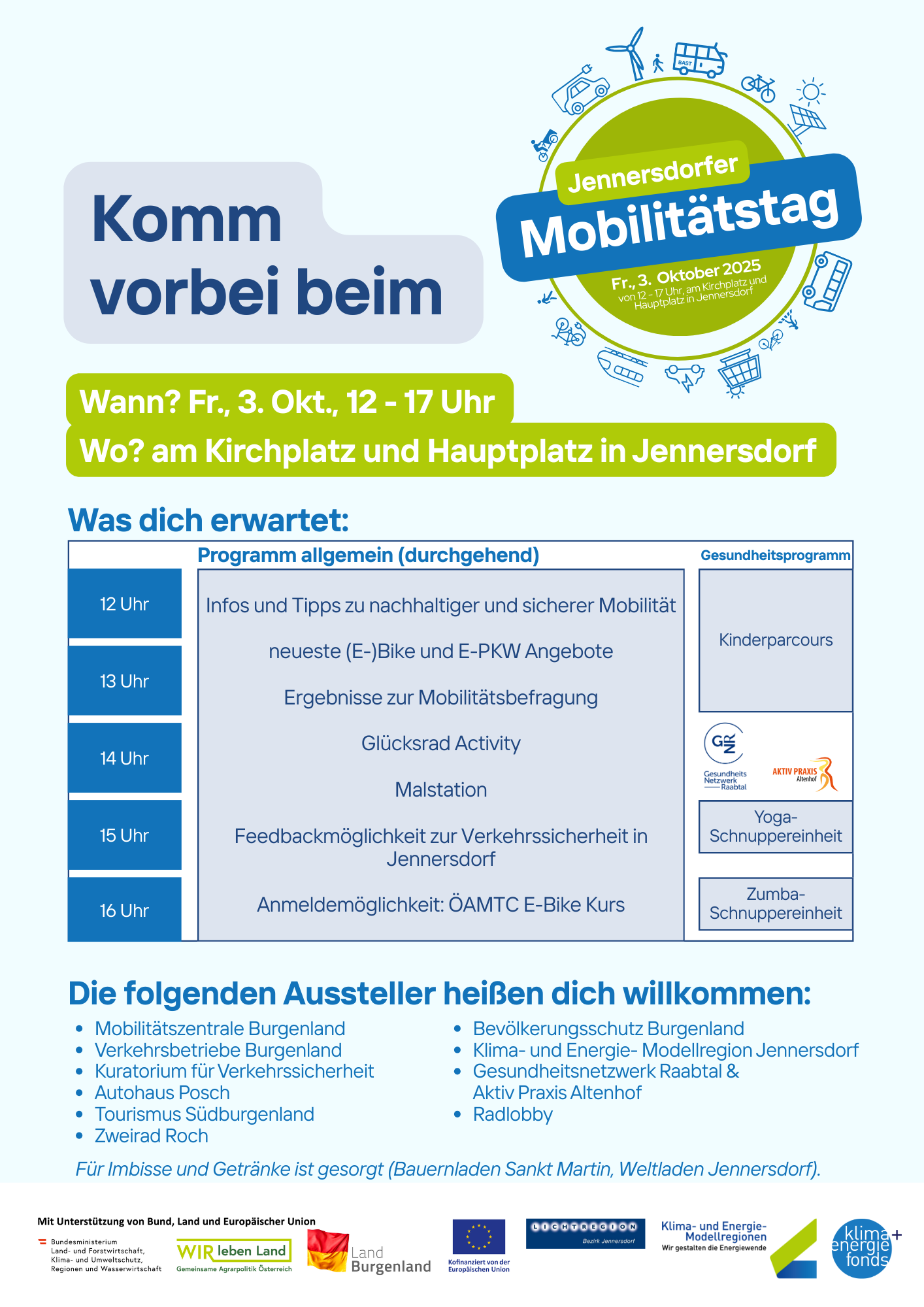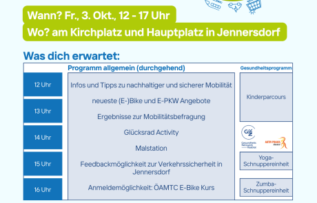 Am Freitag, dem 3. Oktober 2025 laden wir herzlich zum ersten Jennersdorf Mobilitätstag von 12–17 Uhr ein.